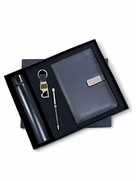 Enhance your everyday essentials with our versatile 4 in 1 Combo Set. This set includes a premium PU Leather Diary, a smart Temperature Bottle, a sleek Hook Keychain, and a stylish Ball Pen.