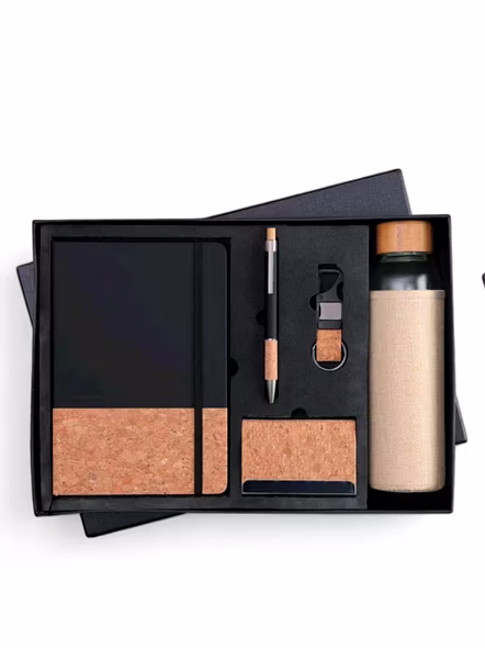 Discover the versatile 5 in 1 Combo Black Cork Set, a chic and eco-friendly collection that includes a diary, ball pen, hook keychain, cardholder, and bottle in a stylish jute cover.