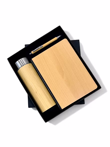 Upgrade your eco-friendly lifestyle with the Bamboo 3 in 1 Eco Combo Set featuring a stylish bottle, a sleek diary, and a smooth pen. This set is the perfect blend of sustainability and sophistication.
