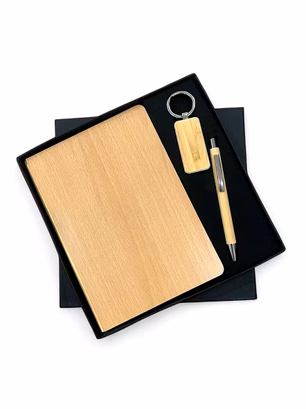 Discover the Eco-friendly 3 in 1 Combo Set featuring a Bamboo Diary, Keychain, and Pen. Embrace sustainability with these stylish and practical essentials.