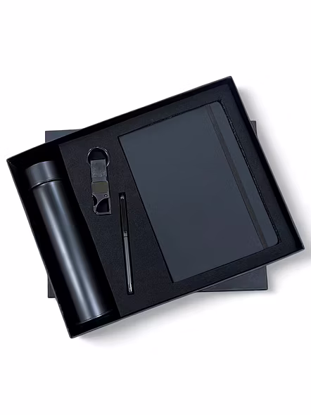 The Jet Black 4 in 1 Combo Set is a perfect blend of style and functionality. Crafted with precision, this set includes a temperature bottle to keep your beverages hot or cold, an elastic diary for jotting down your thoughts, a stylish keychain, and a smooth ball pen. Each item is designed to cater to your daily needs while exuding elegance and practicality.